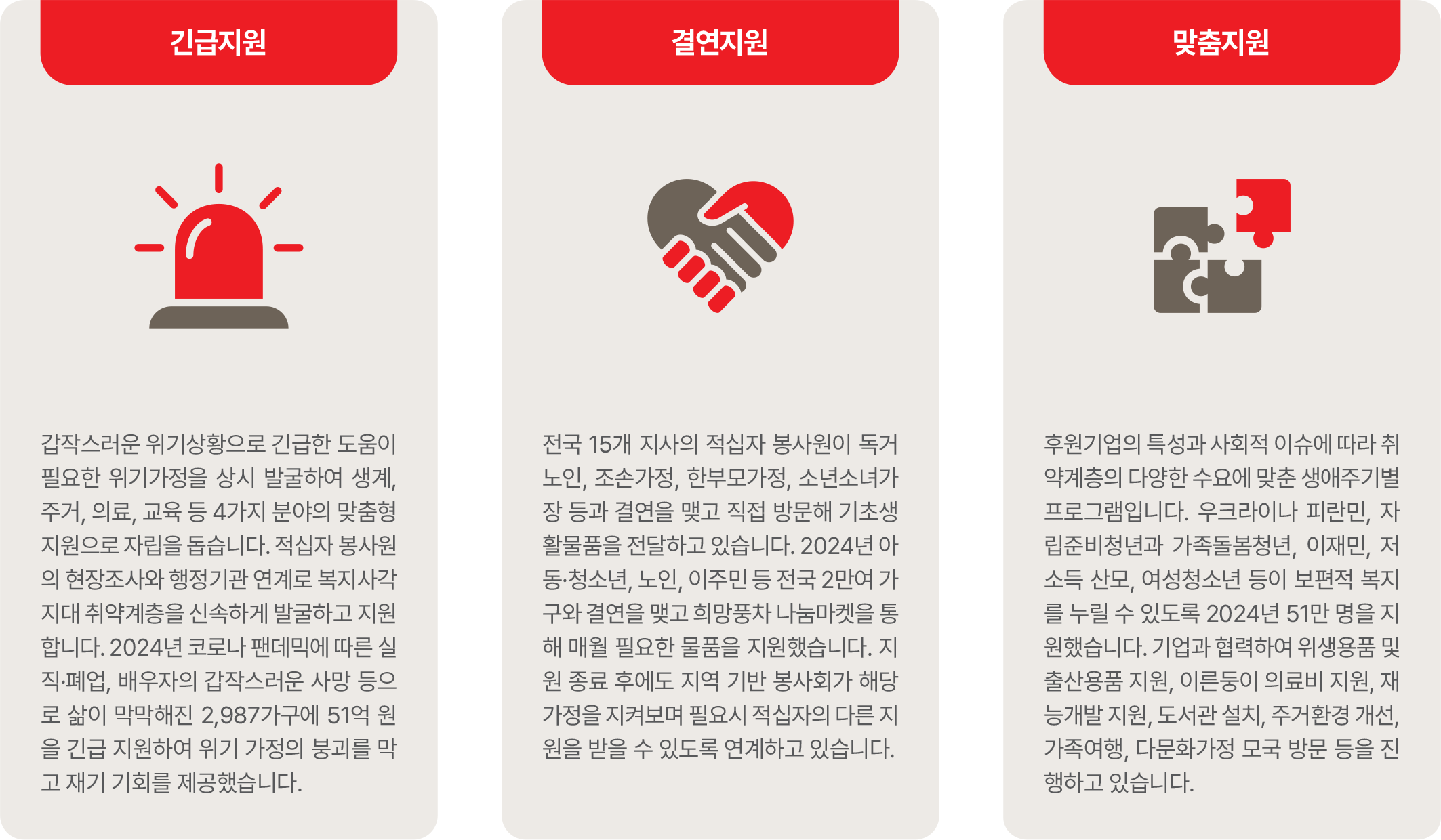 희망풍차 지원사업은 생활 안정을 돕는 긴급지원, 적십자봉사원과 함께하는 결연지원, 후원기업과 연계한 맞춤지원으로 구성되어 있습니다. 꾸준히 확대되는 희망풍차는 2021년 32만 명, 2022년 39만 명, 2023년 55만 명, 2024년 60만 명을 지원하며 더 많은 이웃에게 희망을 전하고 있습니다.